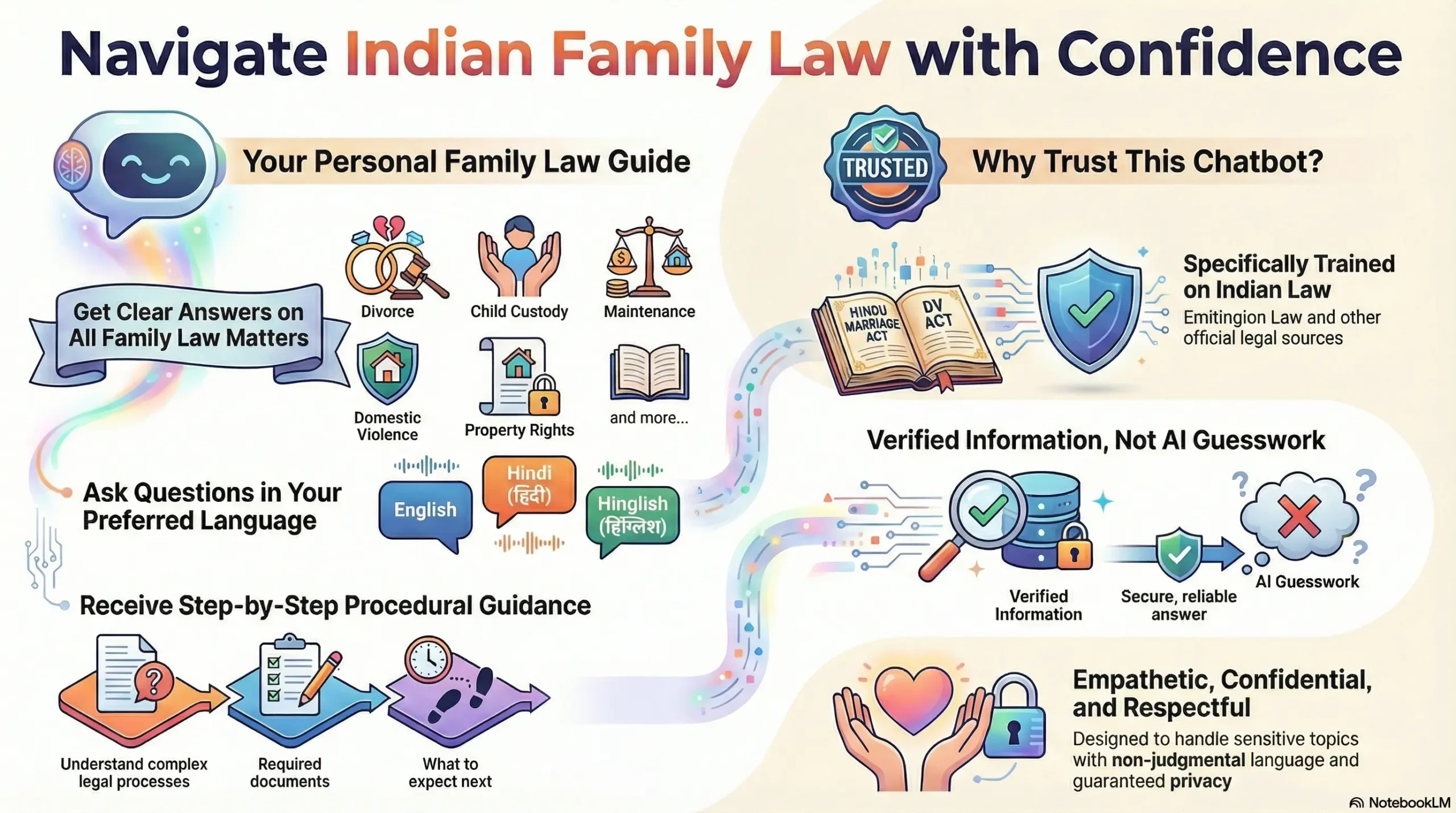 Unlike general AI tools, this chatbot is specifically trained on Indian family laws, personal laws, and real-world cases from Indian courts. It understands the unique challenges Indian families face regarding marriage, divorce, custody, and maintenance.